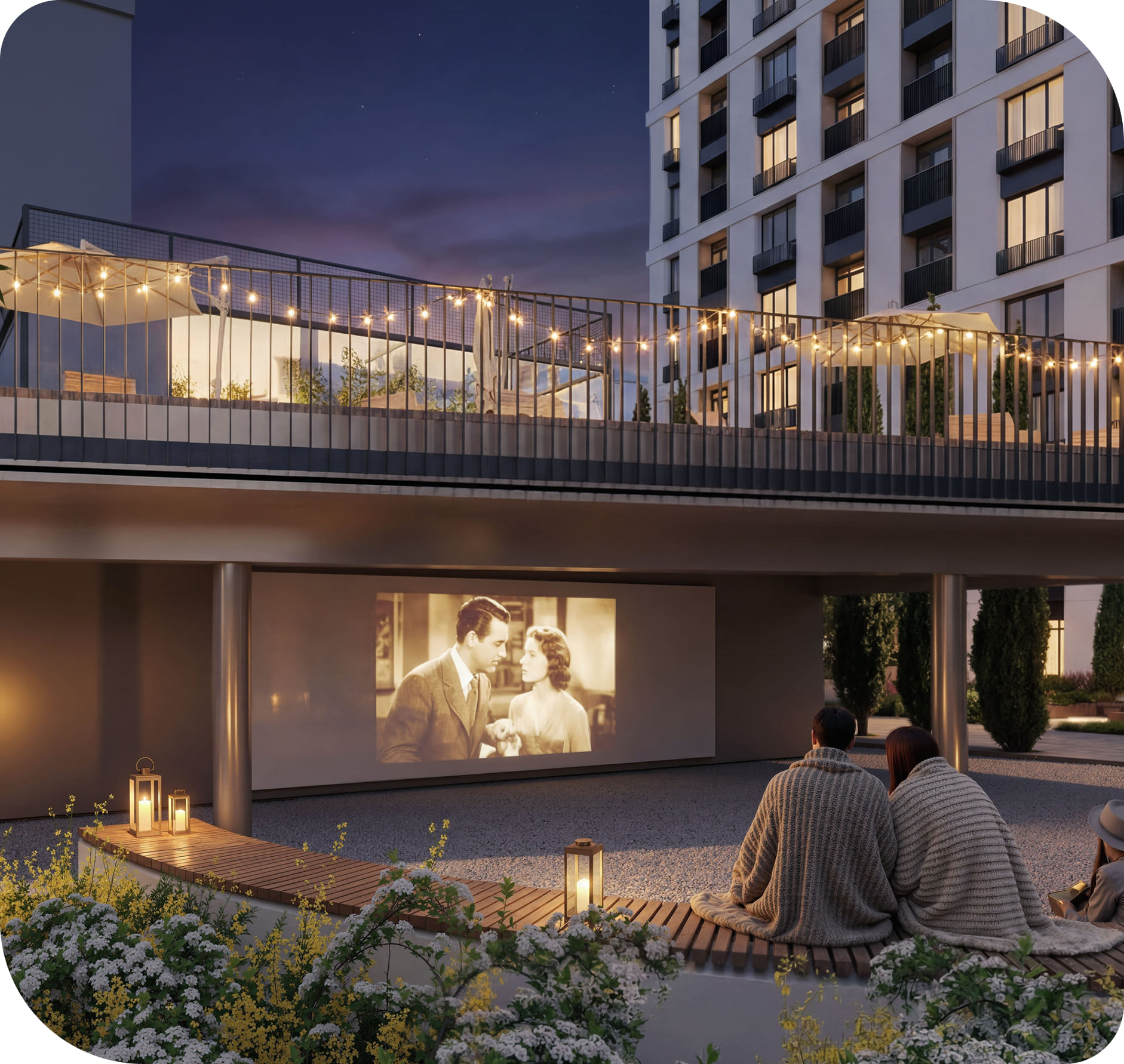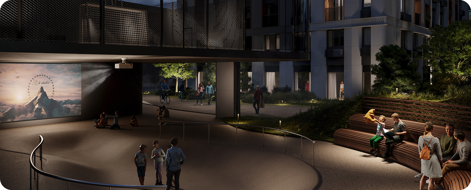 Открытый амфитеатр превращает вечер в событие. Кино, закаты и мягкий свет - атмосфера, в которой хочется задержаться. Место, где каждый вечер можно прожить как маленький праздник, не покидая свой двор