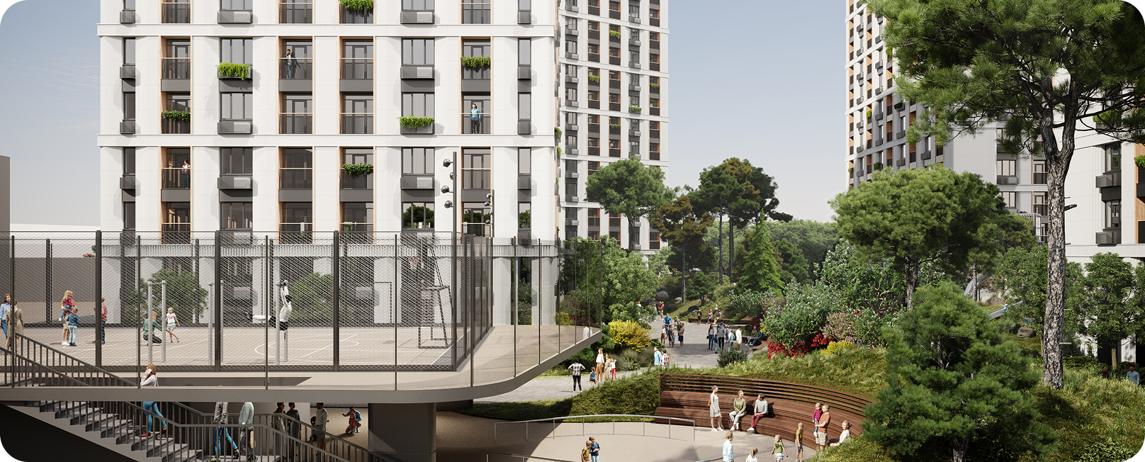 Архитектурный облик жилого комплекса отражает современный подход к городскому пространству: лаконичные линии, гармония форм и внимание к деталям.